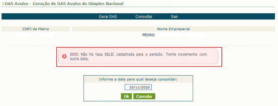 No entanto, é apresentada a mensagem informando que “Não há taxa SELIC cadastrada para o período”, impedindo a geração da guia de recolhimento: