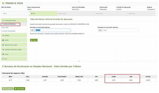 OBS.: Caso não saiba os valores de recolhimento dos tributos ICMS e/ou ISS que precisam ser informados, sugerimos que realize o cálculo por meio do PGDAS, opção “Declarar/Retificar” e depois informe, conforme exemplificado anteriormente.